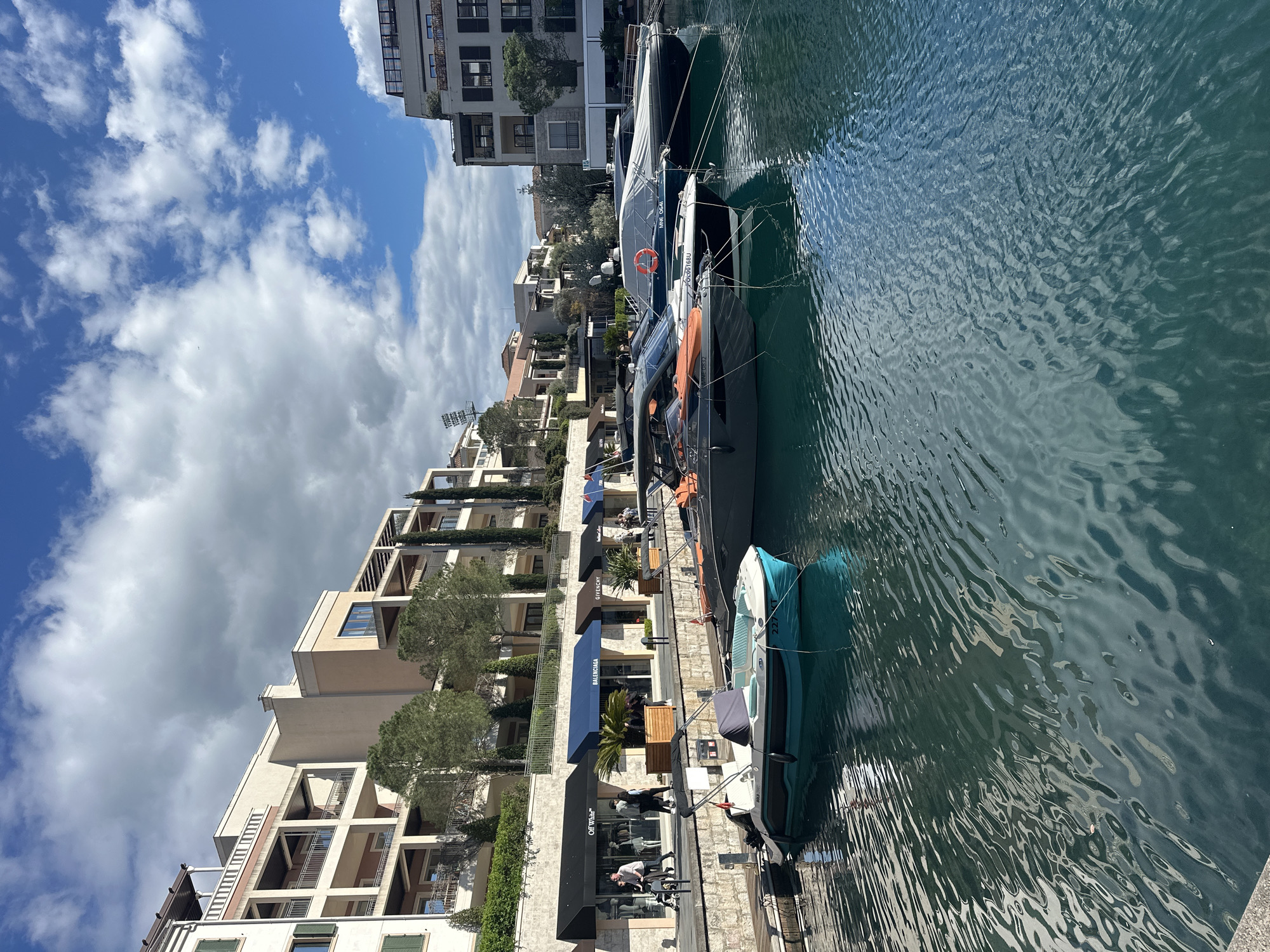 The image depicts a scene in Tivat, Montenegro, showing a row of upscale retail shops lining a waterfront promenade with docked boats. The buildings, constructed of beige stone, house stores like Off-White, Balenciaga, and Givenchy, each marked with dark blue awnings. Pedestrians walk along the promenade. Several boats are moored alongside, varying in size and color, including a larger, dark-colored vessel and a smaller, turquoise boat. The water is choppy, reflecting sunlight. The sky is blue with scattered clouds.