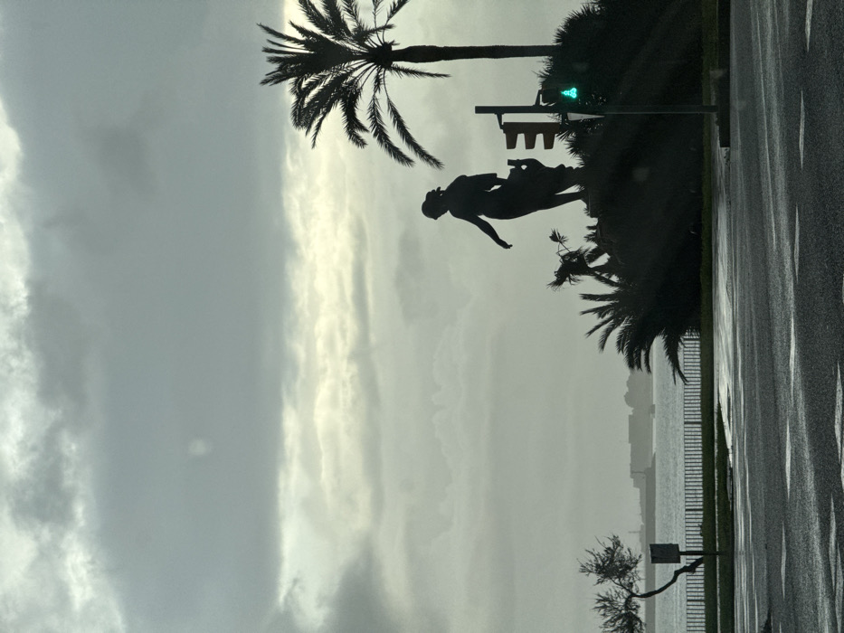 This is a photographic image depicting a coastal urban scene in Palma de Mallorca, Spain, likely along the Passeig Marítim, featuring the statue of "Na Coca." The photograph is taken on an overcast day, resulting in a muted color palette and strong silhouettes. In the foreground, a wet, dark asphalt road occupies the lower portion of the frame, showing faint white dashed lane markings. Reflections on the road surface indicate recent precipitation. Immediately beyond the road, a low black metal fence runs horizontally. To the left, a small, gnarled tree with sparse branches stands beside the fence. The central midground is dominated by the dark silhouette of a large statue of a female figure, positioned on a vegetated mound. The statue depicts a woman in a flowing garment, with her left arm extended downwards and her right arm holding an indistinct object (possibly a child or a vessel) against her body. To the right of the statue, a tall palm tree with broad fronds is silhouetted against the sky. A black traffic light pole stands between the statue and the palm tree, displaying a green pedestrian signal. Dark, dense foliage, including other palm-like plants, surrounds the base of the statue and the traffic light. In the background, the calm, grey expanse of the sea stretches across the horizon. Across the water, a distant cityscape with various buildings and what appears to be a port or harbor area is faintly visible through the atmospheric haze. A large vessel or structure is discernable on the water near the distant shore. The sky is largely covered by thick, grey clouds, with a brighter, lighter grey band near the horizon. A single, faint, bright circular artifact is present in the upper-middle cloud area. No distinct human figures are visible.