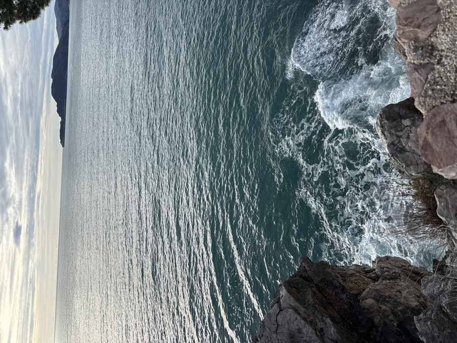 A high-angle perspective captures a body of water, its surface shimmering with reflected sunlight. Waves crash against rocky cliffs at the edge of the frame, creating frothy white patterns. A distant landmass is visible on the horizon, silhouetted against a cloudy sky. The foreground is dominated by textured rocks and sparse vegetation clings to the cliffs.