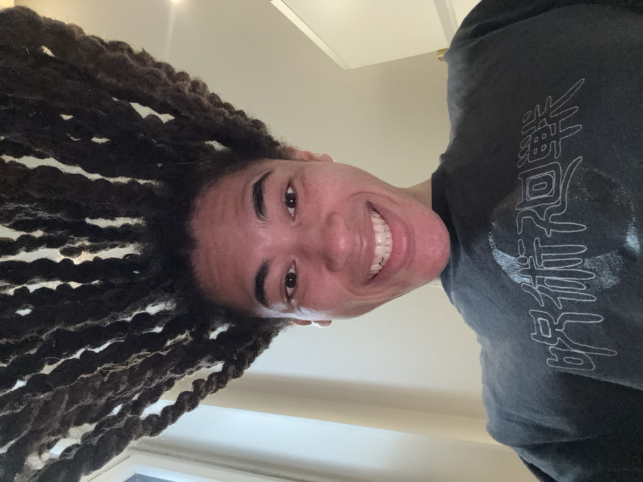 A photograph, inverted, depicts a single individual in an indoor setting in Les Ulis, France. The subject's head is positioned at the bottom of the frame, facing the viewer directly, with the body extending upwards and largely out of view. The individual has a medium skin tone, dark eyes, and dark, thick dreadlocks or braided hair. A wide, open-mouthed smile is present, revealing upper teeth. The subject is wearing a dark grey or black t-shirt featuring white graphic text, identified as East Asian script, across the chest area. The background consists of light-colored walls. On the inverted left side of the frame, a segment of a white door frame or cupboard is visible. On the inverted right side, a vertical white element and brighter light suggest the presence of a window.