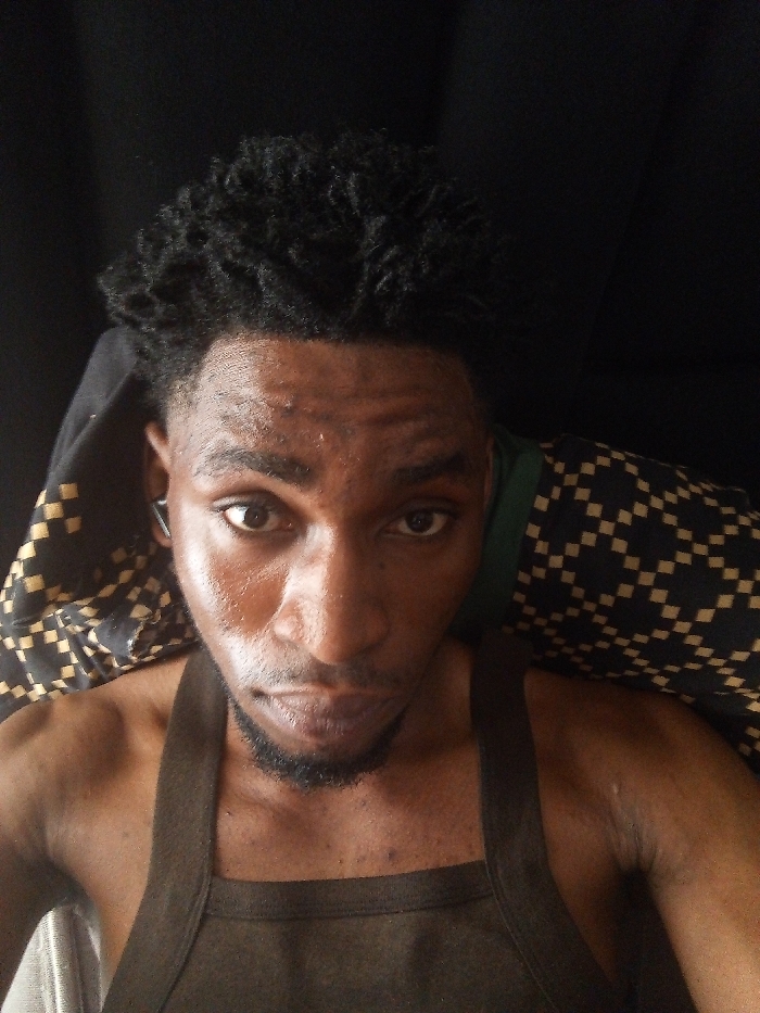 The image presents a close-up, head-and-shoulders portrait of an adult male of dark complexion, centered and looking directly at the camera. He has short, kinky black hair with a faded hairline and a neatly trimmed dark beard and mustache. Visible perspiration or oil is present on his forehead and nose. He wears a dark, sleeveless top with visible shoulder straps. A small, metallic earring or ear cuff is present on his left earlobe. Behind and partially draped over his shoulders is a dark fabric with a repeating pattern of light-colored squares arranged diagonally. The background is otherwise uniformly dark. The scene is located in Lokoja, Nigeria.