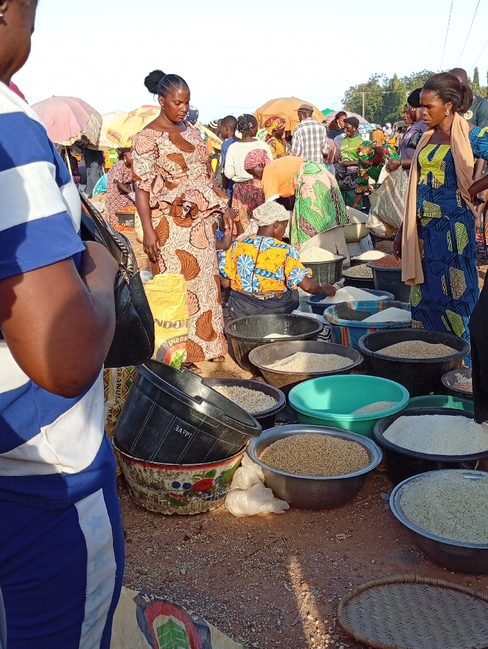 The image depicts a busy outdoor market scene in the city of Rido, Nigeria