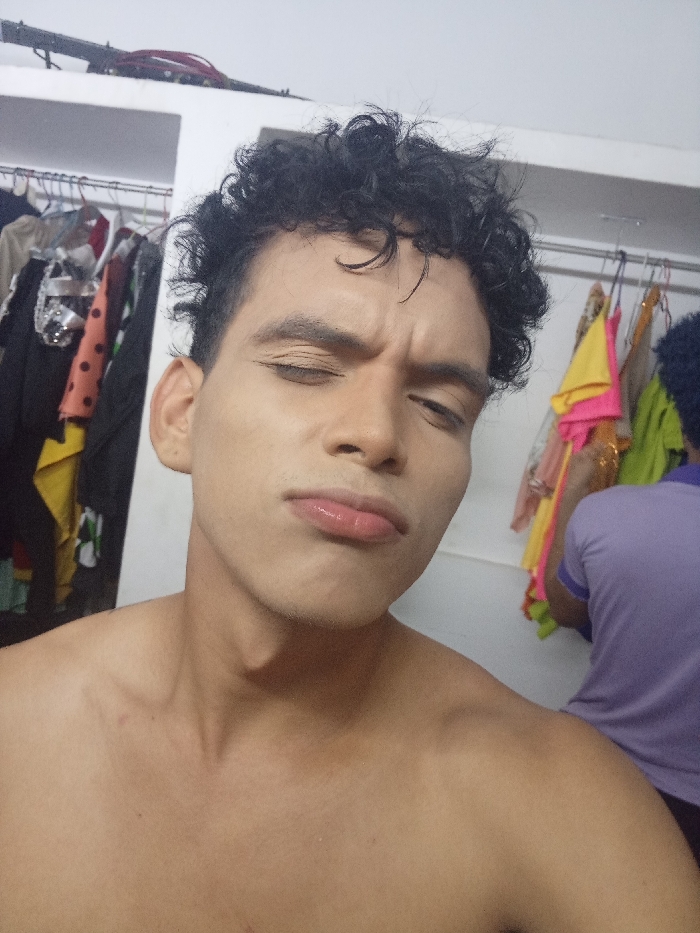 A person with dark curly hair, light skin, and light makeup is posing for a selfie. The person's eyes are closed, and their lips are pursed. The person is shirtless. Behind them is a closet with clothes hanging on hangers. A person in a purple shirt is standing in the background near a rack of brightly colored costumes. A metal rod with equipment attached is above the closet.