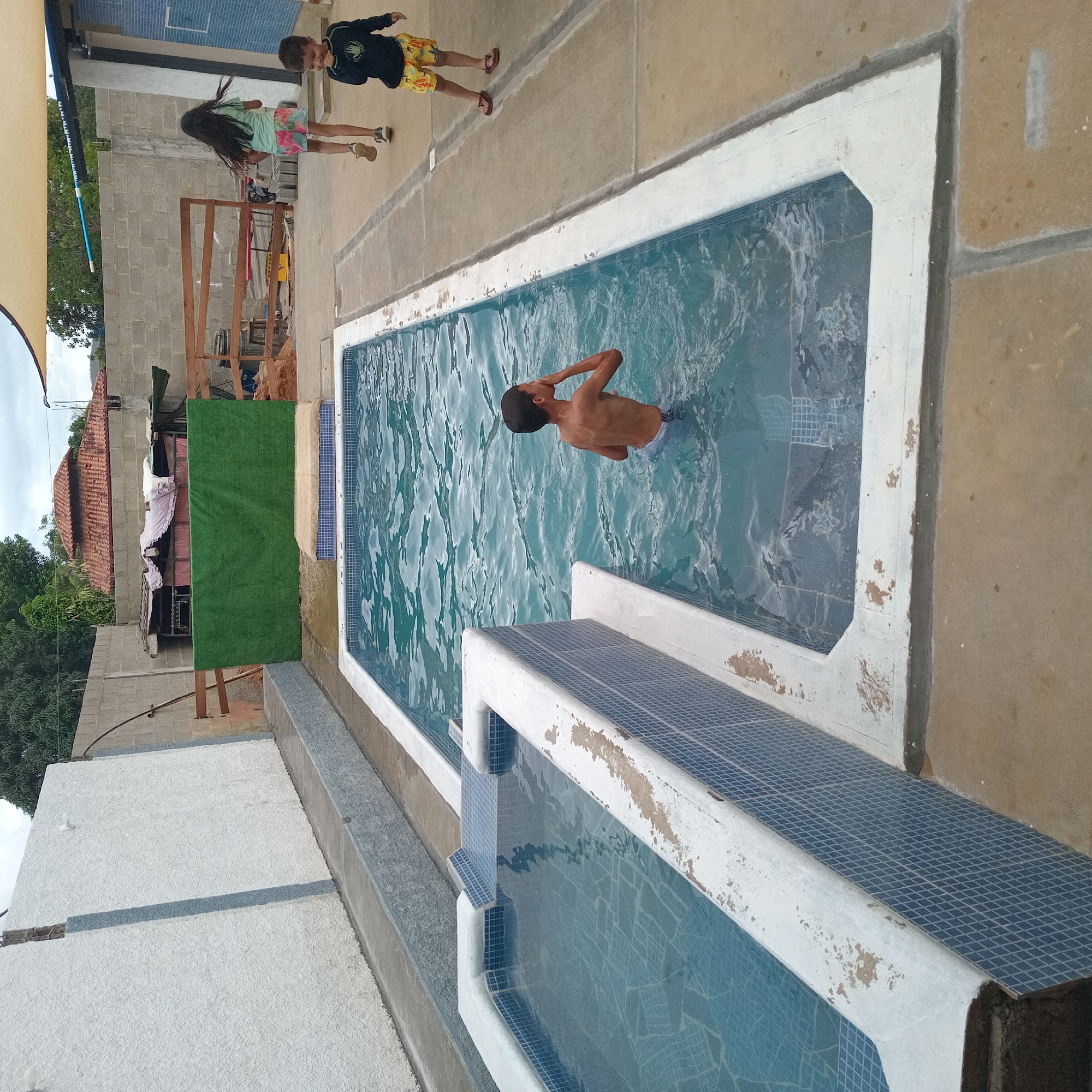 This image depicts a rectangular swimming pool with blue-tiled interior and a white coping. A shirtless young boy stands in the pool, appearing to be adjusting his hair or ears. Two children, a girl in a dress and a boy in swim trunks and a rash guard, walk away from the camera on a concrete patio. The background shows a partially constructed building with concrete blocks and a wooden structure. There is a green artificial turf mat. Behind the building, a red-tiled roof and trees are visible. The location is likely in El Eneal, Venezuela, as stated.