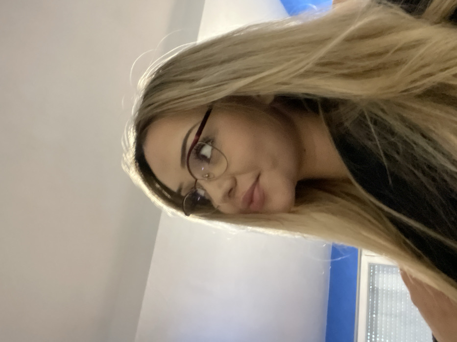 A woman with blonde hair and glasses looks to the left of the frame. She has light skin and is wearing a dark top. The background is light blue and white. A window with closed blinds is visible in the bottom right corner. The image is taken from a slightly high angle, rotated counterclockwise.