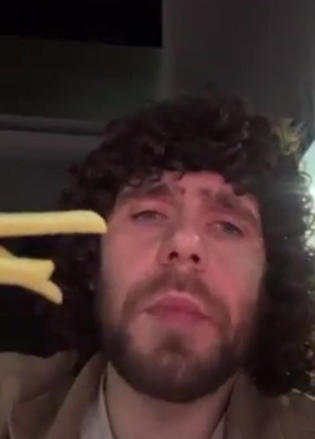 A man with curly brown hair and a beard holds up several French fries in front of his face, then eats one