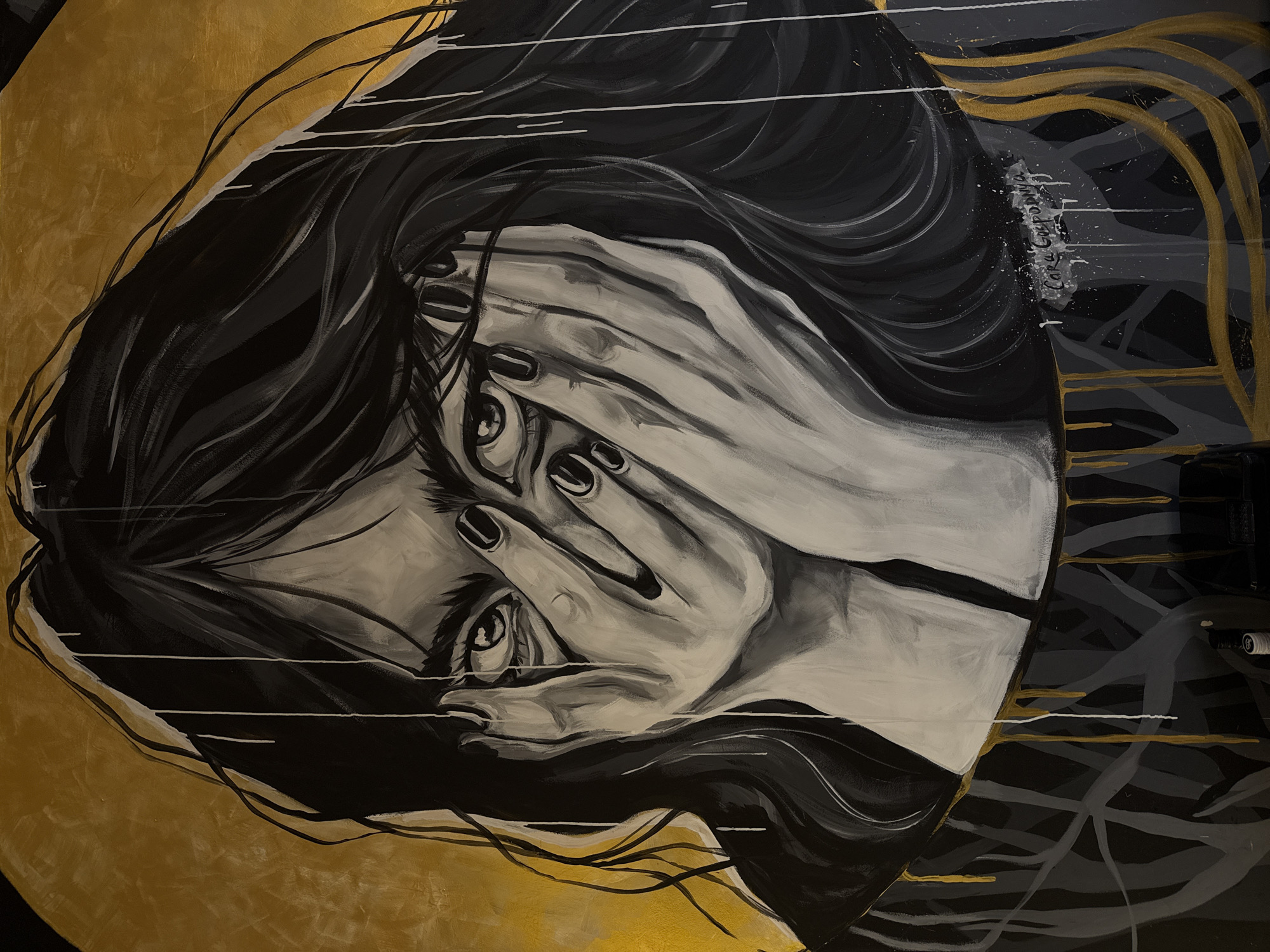 The image is a tilted close-up of a painting. The painting depicts a woman covering her face with her hands. Her eyes are visible between her fingers. The color palette is predominantly black, white, grey, and gold. The background is abstract with broad strokes and linear elements. The painting's style is expressive with visible brushstrokes. Text, likely the artist's name, is present on the right side of the painting, though illegible. The painting is currently located in Krasnoyarsk, Russia.