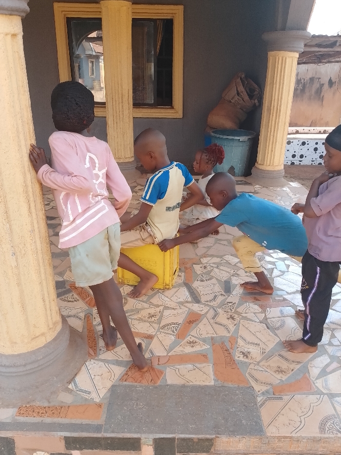 The scene depicts an outdoor paved area, likely a veranda or porch, of a building in Ejule, Nigeria. Five barefoot children of varying ages are present. The ground is a mosaic of broken and intact ceramic tiles featuring beige, brown, and patterned designs, set into a gray mortar base. Two fluted, yellow-painted columns support an overhang, with one prominent on the left and another partially visible on the right. The background features a dark gray wall with a brown-framed window containing reflective glass. To the right of the window, a large, beige sack leans against the wall, next to a light blue plastic bucket. A white wall with black polka dots is visible on the far right. On the left, a child with black braided hair, wearing a pink long-sleeved shirt with white graphics and light-colored shorts, leans against the leftmost yellow column, facing away from the camera. In the center, another child with closely cropped dark hair sits on a yellow plastic crate, wearing a yellow shirt with blue and white stripes and light shorts. Adjacent to this child, a smaller child with reddish-brown braided hair is partially visible, wearing a light-colored garment. To the right of the seated child, another child with closely cropped dark hair is crouched forward, wearing a blue t-shirt and light yellow pants, with hands near the seated child or crate. On the far right, a fifth child, partially obscured, stands facing left, wearing a light purple long-sleeved shirt and black pants with white stripes and a logo on the leg. The children appear to be engaged in informal interaction or play.
