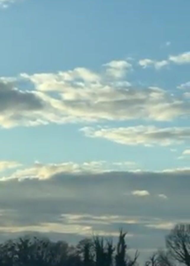 view from a moving vehicle. The sky is light blue with bands of grey and white clouds. Trees are visible along the roadside. A silver or white car passes in the foreground. A highway sign with an upward arrow and a "110" speed limit is visible. The video is shaky due to the movement of the car.