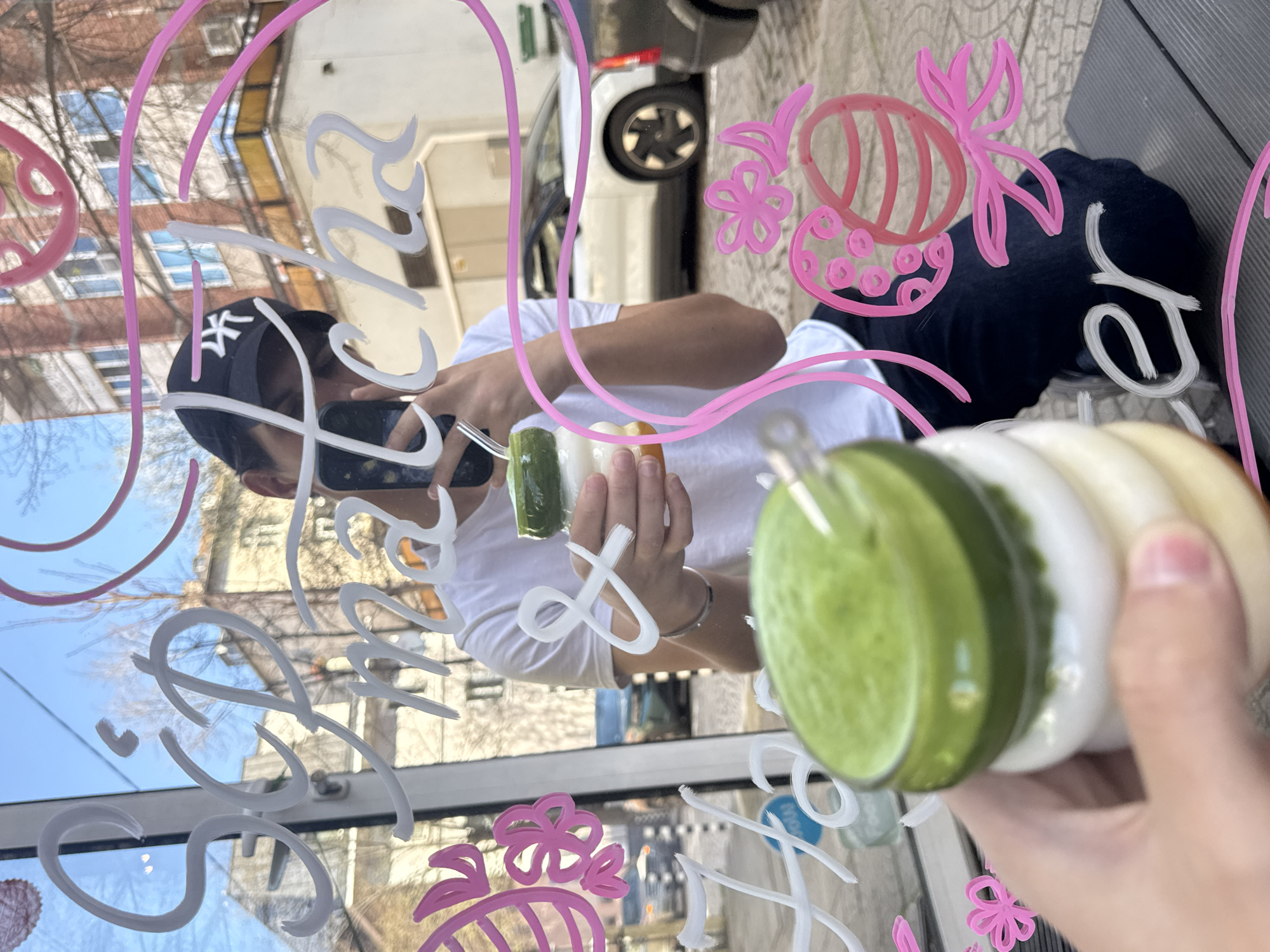 A person wearing a white T-shirt and a baseball cap is reflected in a window with decorative drawings. The reflection shows the person holding a mobile phone and taking a photo of a stack of circular food items, including one green layer, with someone else's hand also holding the food. The reflection also includes the street outside, including buildings, bare trees, and a parked car. The decorative drawings on the window are in pink and white and include floral and abstract designs. It's likely this is in Sofia, Bulgaria, based on the "Sofia" label.