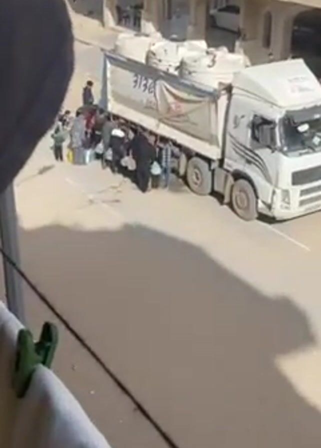 group of people gathering around a large, white truck that is delivering water. The truck has several white tanks on the back. People are filling containers with water from the truck's spigot. Most of the people are wearing casual clothing, and some are wearing traditional Islamic attire. A few children are also present, carrying small containers. A bicycle is parked on the side of the truck. The scene is set in an urban environment, with apartment buildings visible in the background. A white towel hangs from a clothesline visible on the left side of the frame, indicating the video was likely taken from a residential balcony or window. The pavement shows some discoloration, possibly due to water spillage.