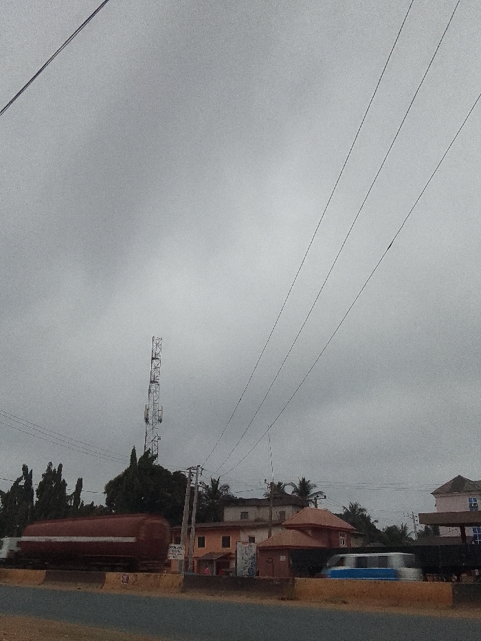 Overcast sky with prominent power lines. A tall cell tower stands among green trees. In the foreground, a road with a reddish-brown tank-like structure. Buildings are situated behind the road, and a blur of motion, likely a vehicle, is captured. The overall scene conveys a gloomy, possibly urban or suburban, environment.