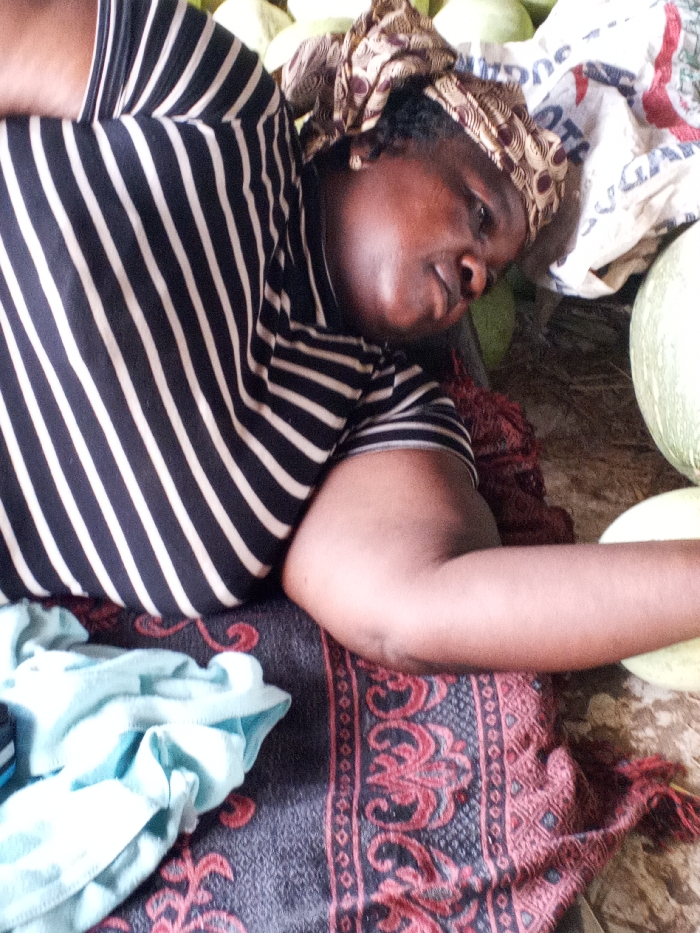 A woman with a patterned headscarf rests amidst produce. She wears a striped top, her arm extending over a patterned blanket. Light blue fabric is also visible. She is surrounded by green produce, some of which are used as a pillow, along with a white sack labeled "SUGAR." Her eyes are open, but she appears relaxed or tired.