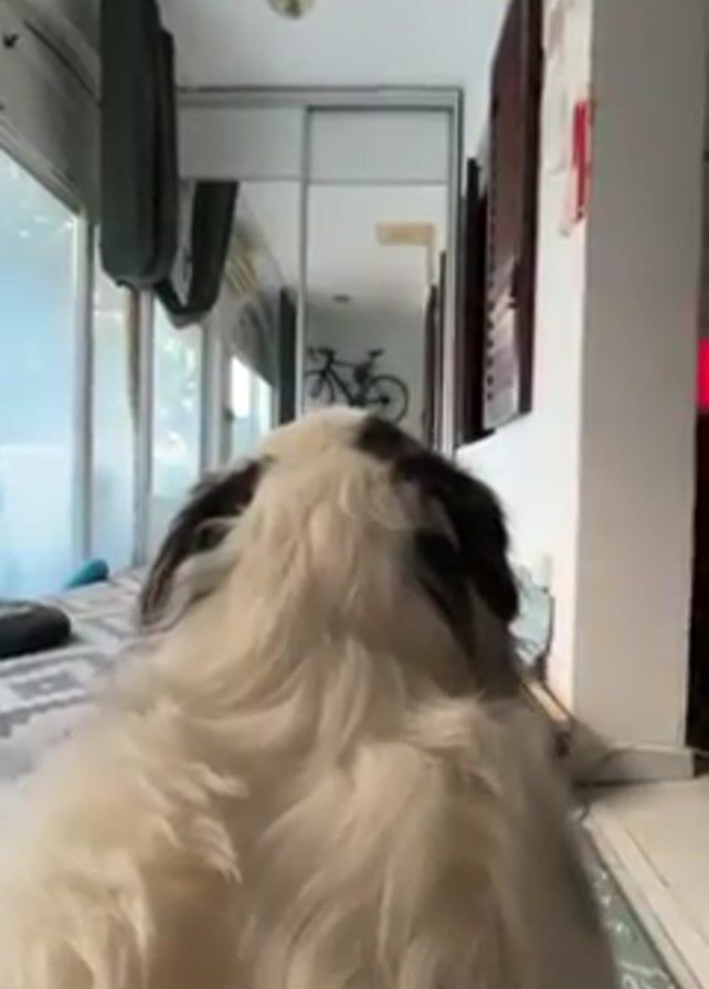 From a low angle, the back of a medium-sized, fluffy dog with black and white fur dominates the foreground. The dog is lying down and facing away from the camera. Behind the dog, the reflection in a sliding mirror door shows a young person holding the dog up, nose-to-nose with it. The person is wearing a white garment. Above the reflected person and dog is a black bicycle mounted on the wall of the room. The room also contains wooden-shuttered windows and a patterned rug on the floor.