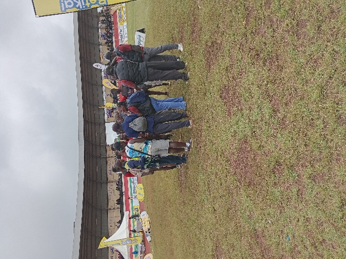 The image depicts an outdoor scene within Kinoru Stadium (Meru Stadium) in Meru, Meru County, Kenya, under an overcast sky