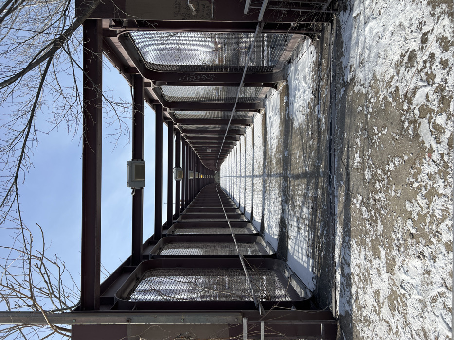 A tall, open-air metal bridge extends into the distance, its brown structure framing a blue sky on the left. Bare tree branches reach into the frame. The bridge's walkway is partially covered in snow. A concrete barrier lines the right side, also marked with snow and what appears to be discoloration. Electrical boxes are attached to the bridge's supports on the left. The perspective creates a strong sense of depth as the bridge converges in the distance.