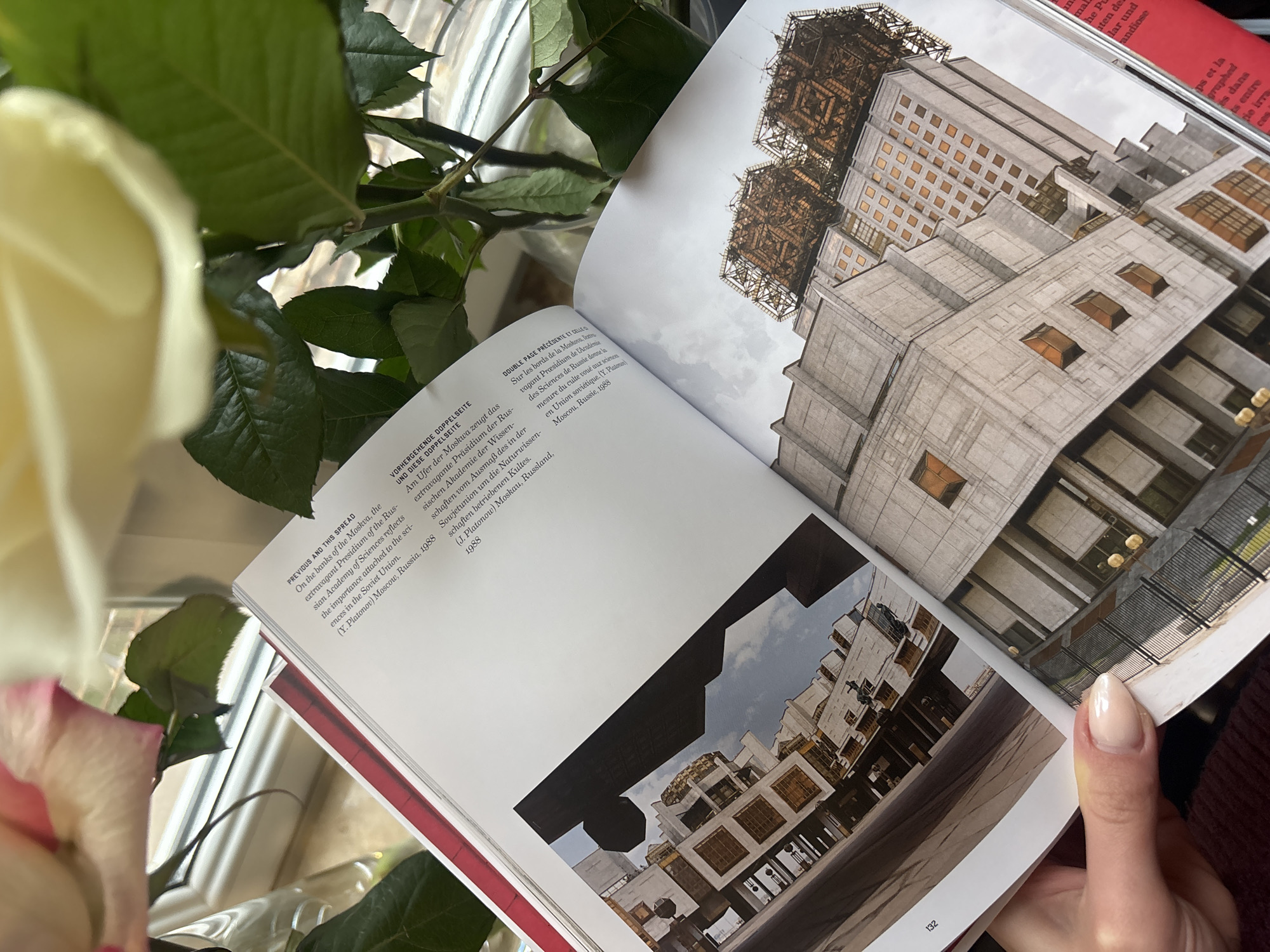 A person's hand, featuring light-toned skin and fingernails with a light, opaque manicure, holds open a large format book. The book displays a two-page spread. The left page (page 132) shows a photograph of a modernist concrete building with geometric forms and textured facades under a blue sky. The right page features a close-up photograph of the upper section of a similar architectural structure, characterized by multiple tiers of rectangular windows and an elaborate, golden, grid-like framework on its roof. Accompanying text on the left page identifies the depicted structure as "the Presidium of the Russian Academy of Sciences," designed by Y. Platonov in Moscow, Russia, and dated 1988. In the blurred foreground, a white rose with a faint pink blush on its petals is visible within a clear glass vase, positioned to the upper left. Another blurred white rose in a similar clear vase appears in the upper right background. A white-framed window is partially visible behind the roses. The scene is set indoors, with ambient natural light. The buildings depicted within the book are located in Moscow, Russia, according to the text provided on the page, not Yerevan, Armenia.