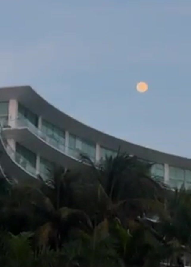 beach scene, focusing on a large, yellowish moon in the sky. The camera pans upwards to emphasize the moon, which is the central subject. In the foreground, there's a white curved building, likely a hotel, partially obscured by palm trees. Below the trees, there are thatched-roof beach umbrellas and a few people, some standing and some relaxing in chairs. The beach appears sandy. The overall setting suggests a tropical resort atmosphere.