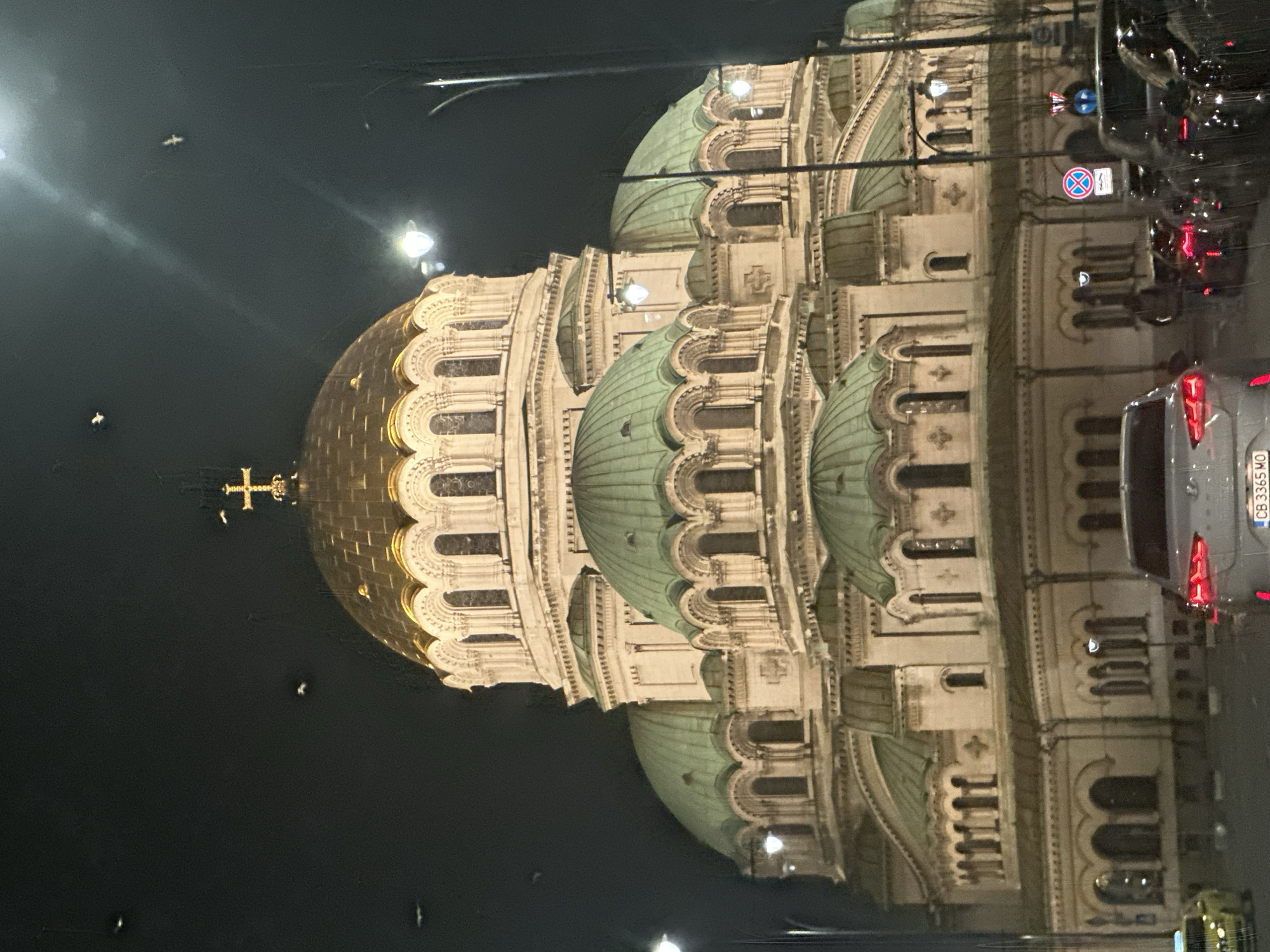 The image displays the St. Alexander Nevsky Cathedral in Sofia, Bulgaria, illuminated at night. The cathedral features a large central golden dome topped with a cross, surrounded by numerous smaller green domes and an intricately detailed, light-colored stone facade with multiple arched windows. The sky above is dark. In the foreground, a silver-grey sedan is visible from the rear, its red taillights illuminated. The vehicle's license plate reads "CB 3365 MO". To the immediate left, a portion of a yellow vehicle, likely a taxi, is visible. To the right, additional vehicles are parked or in traffic, and a person is discernible walking between them. Two streetlights cast bright illumination from the upper left and upper right of the frame. On the right side of the street, traffic signs are visible, including a "No Stopping/Standing" sign (blue circle with red diagonal line) and a "No Entry" sign (red circle with white horizontal bar). Several small, indistinct white shapes, possibly birds, are present in the dark sky above the cathedral.