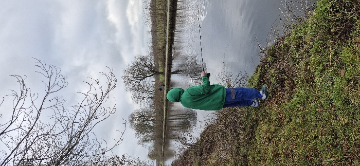 The scene is set along a canal or river in Noyelles-sur-Escaut, France, on an overcast day. In the foreground, a single individual is positioned on a grassy bank, viewed from behind. This person is wearing a vivid green hooded sweatshirt with the hood drawn over their head, blue pants, and dark shoes with white soles. They are actively holding a fishing rod, extending it over the calm, dark water. The immediate bank is covered with short green and brown grass and some sparse vegetation. On the opposite side of the water, a dirt or gravel path runs parallel to the canal. Two small, indistinct figures are visible walking along this path in the distance. The background features a line of numerous bare deciduous trees, some of which are reflected in the water. Overarching the scene is a cloudy, light grey sky. Bare branches from a tree on the immediate left intrude into the upper left quadrant of the frame.