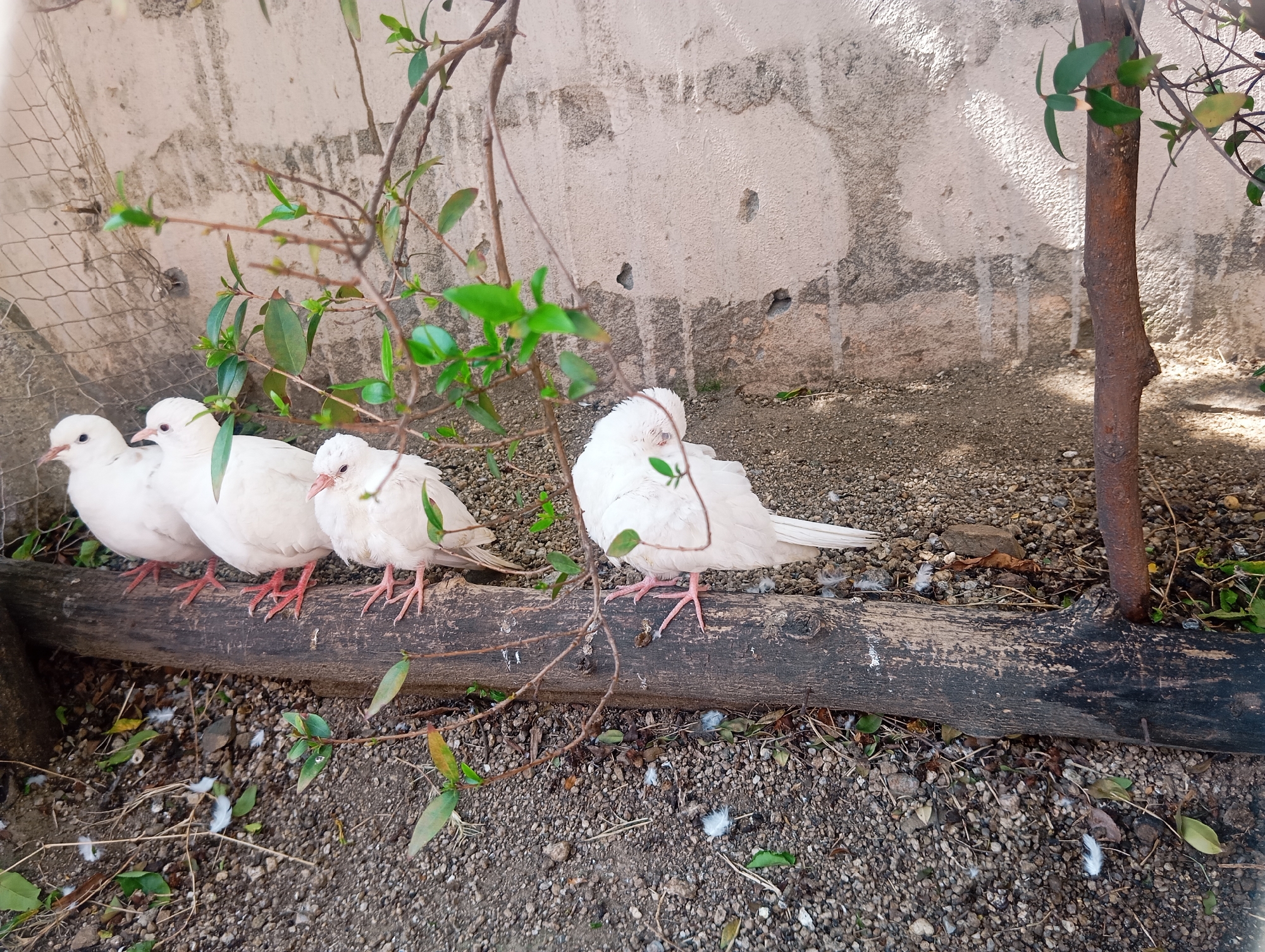 - "The image depicts four white doves perched on a dark, horizontal wooden log in an outdoor, semi-enclosed environment, likely within the city of Lassan, Pakistan" by FM-dAXDx2, licensed under CC BY 4.0