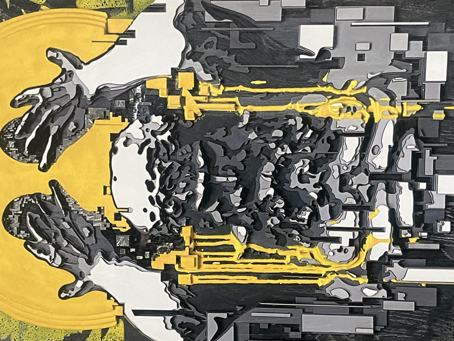 The image displays a multi-layered, abstract artwork characterized by a stark color palette of yellow, black, white, and various shades of gray