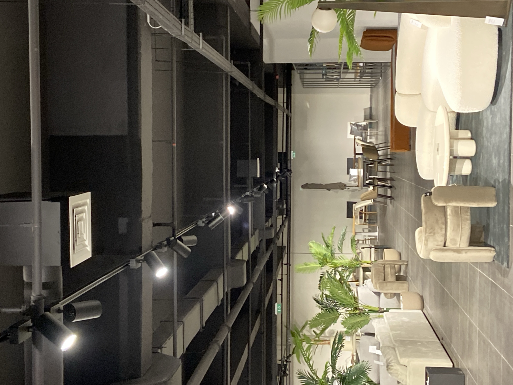 This image depicts the interior of a furniture showroom located in Dub, Montenegro. The ceiling is black, featuring exposed grey ventilation ducts, electrical conduits, and a track lighting system with multiple individual spotlights providing illumination. White square air vents are visible in the ceiling. The walls are predominantly light-colored, serving as a backdrop for the merchandise. The floor is composed of large, grey square tiles. In the foreground to the right, a multi-sectioned, off-white curved modular sofa with a textured fabric is arranged on a blue-grey area rug. A round white coffee table with thick cylindrical legs sits in front of the sofa. Two beige, rounded armchairs are positioned on the rug to the left of the sofa. A tall, dark floor lamp with a spherical white shade is partially visible on the far right. Towards the mid-ground on the left, several light-colored sofas and an armchair are displayed. Interspersed throughout the showroom are multiple large potted artificial palm-like plants. A black square planter is visible in the immediate foreground on the left. Further into the mid-ground, multiple dining sets are visible, including tables and chairs of various designs. In the background, a tall, dark open shelving unit is present on the right, and a folded dark-colored outdoor umbrella stands upright on the left. The scene is devoid of human presence.