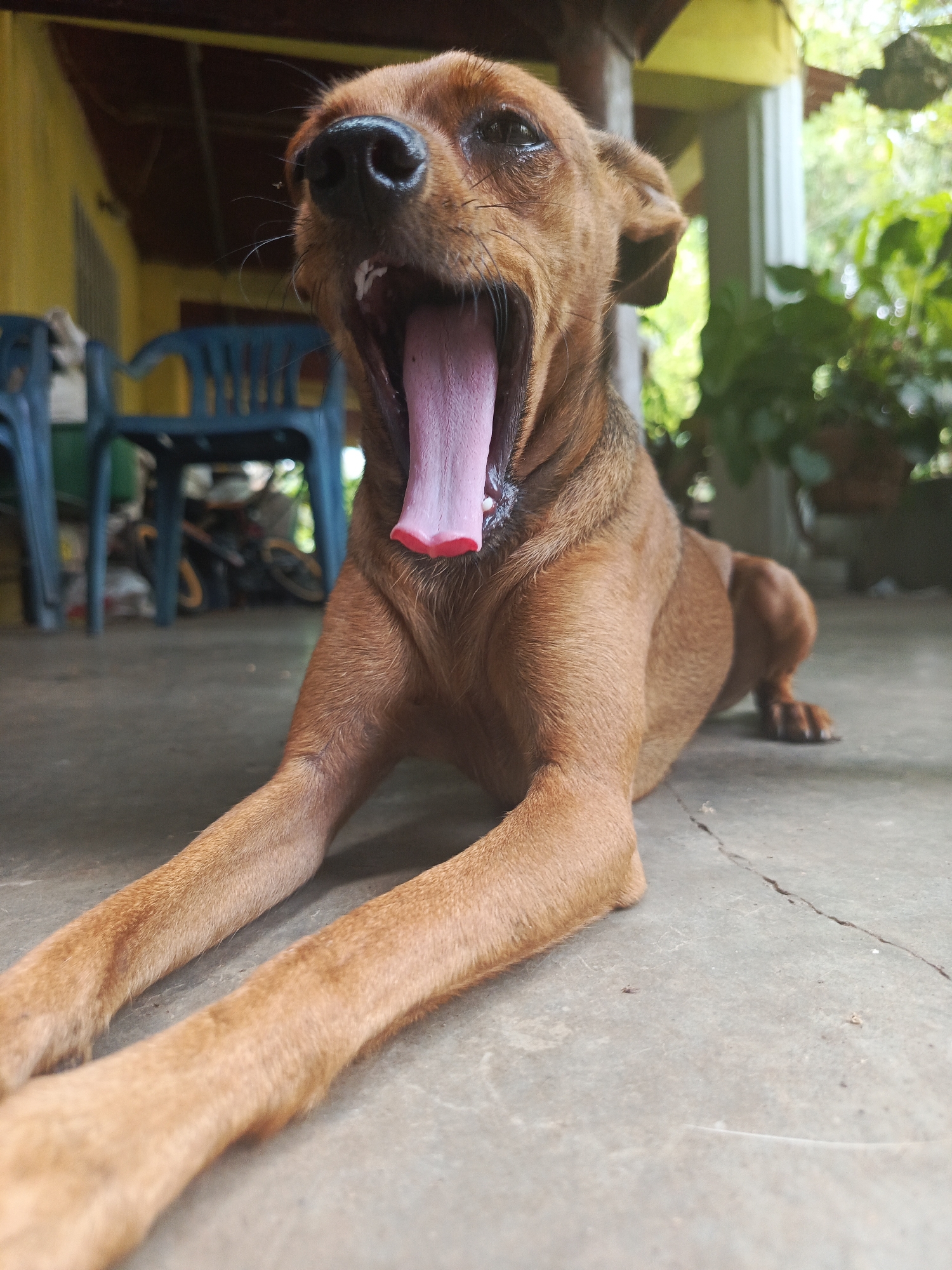 A medium-sized, brown dog is lying on a concrete floor with its front legs extended forward. The dog's mouth is wide open in a yawn, revealing a pink tongue. Behind the dog, there are blue plastic chairs, a bicycle, and various potted plants. The background suggests an outdoor patio or porch area. The location is not indicated by the image itself; the city of Monagas, Venezuela, is extraneous information not discernible from the visual content.