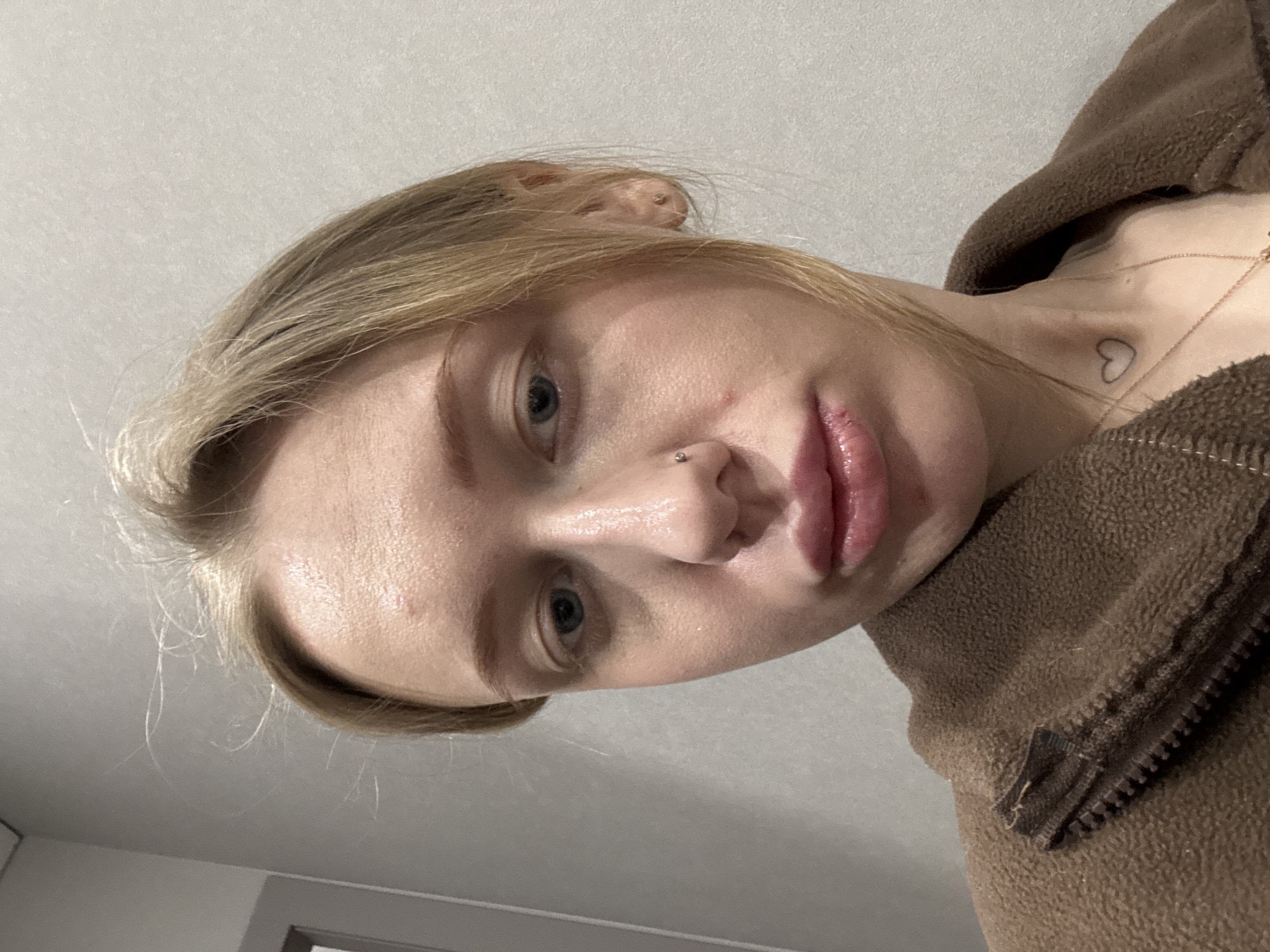 A close-up, slightly downward-angled view of a fair-skinned person with blonde hair. The person has blue eyes and a nose piercing. They are wearing a brown fleece jacket. A small heart-shaped tattoo is visible on their neck, along with a gold chain. The background is a plain, light-colored wall. The location and the city of Azov, Russia are not possible to determine.