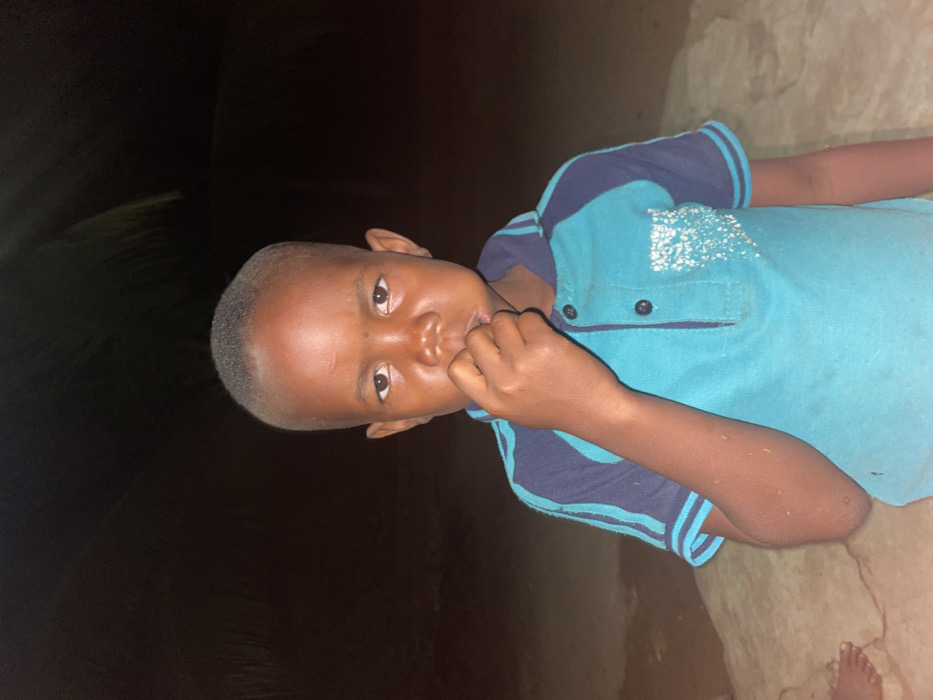 A young, dark-skinned boy with a closely cropped haircut is seen from the chest up