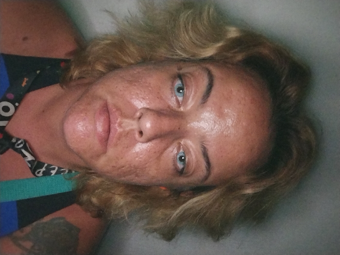 close-up portrait of a fair-skinned woman with long, wavy, light brown hair. She is wearing a blue tank top with a colorful patterned bandana tied around her neck. The woman is looking directly at the camera with a neutral expression. Her skin has noticeable blemishes and wrinkles. Her eyes are a bright blue, and she appears to have a tattoo on her right shoulder. The background is a blurry, gray wall. The coordinates provided in the prompt (-22.109, -41.476) correspond to a location in the city of Quissamã, Brazil. However, the image is not contextualized to this specific location, and there are no features in the image that indicate the woman is in Quissamã.