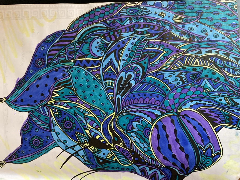 This image presents a completed artwork from a coloring page, depicting a stylized animal head in profile, facing left. The subject's features, including prominent pointed ears with tufts, are consistent with a feline such as a lynx. The animal's form is intricately filled with a dense array of abstract and decorative patterns, rendered in a zentangle or mandala-inspired style. The primary color palette comprises various shades of blue (dark blue, medium blue, and light blue), teal, and purple. The intricate designs are defined by black outlines, with sporadic accents of light yellow or lime green within certain patterns. The artwork appears to have been colored with markers or pens on white paper, showing minor inconsistencies such as visible streaking and slight color bleed in some areas, particularly noticeable within the yellow and lighter blue sections. The background consists of the uncolored white paper. Faint, extraneous yellow marker coloring extends slightly beyond the left and upper edges of the primary subject. A subtle, uncolored patterned border is discernible along the right edge of the paper, indicative of a page from a coloring book. There are no individuals, actions, or interactions depicted within the scene. The image is a two-dimensional representation of an artwork and does not contain any visual information or contextual cues to indicate a specific physical location within the city of Rostov-on-Don, Russia, or any other geographic area. Therefore, no details regarding Rostov-on-Don can be derived from this visual data.
