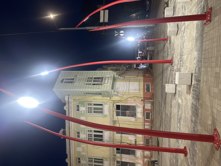 The image depicts an urban night scene in Dobrich, Bulgaria, observed from a low angle within a pedestrian zone. In the foreground and midground, a paved area with patterned grey and tan rectangular pavers is visible. Six tall, slender, bright red poles, each topped with an illuminated white light source, curve upwards and inwards from the left and right sides of the frame; these lights exhibit significant lens flare. Several grey, unpolished concrete block seats or barriers are positioned on the pavement between these red poles. In the background on the left, a multi-story building with architectural detailing occupies a prominent corner. The facade is primarily light yellow on the left section, transitioning to a pale green on the corner and right section. The lower parts of the building exhibit peeling paint and a reddish-brown foundation. Multiple windows with white frames are visible; one ground-level window on the yellow facade shows visible graffiti. To the right of the buildings, beyond the red poles, a street is discernible in the distance with faint vehicle lights. A standard streetlight with a warmer yellow glow is also visible on the right. The sky is dark blue-black, indicating nighttime. No individuals are clearly visible.