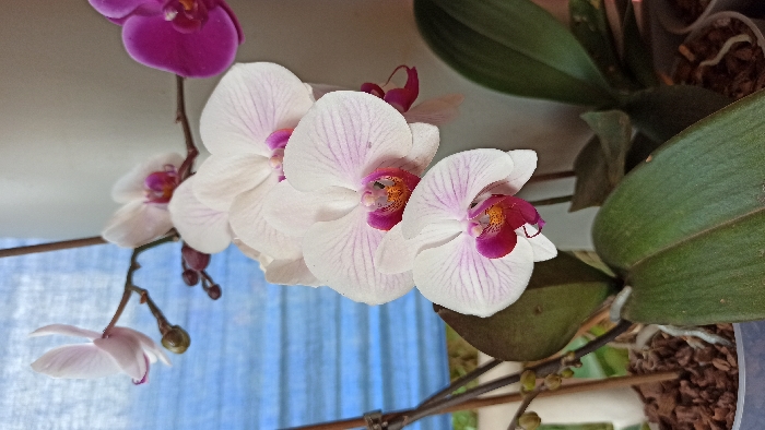 The image depicts an orchid plant featuring a mix of white and purple blooms. Several white petals exhibit delicate purple veining. The orchid is planted in a pot filled with brown, fibrous material. Green leaves, some darker in tone, are prominent on the right side of the image. A partially visible blue curtain serves as a backdrop.