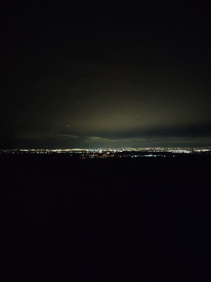 The image displays a panoramic night view of the city of Balsha, Bulgaria, captured from an elevated perspective. The lower half of the frame consists of an undifferentiated dark expanse, devoid of discernible features. Above this, a horizontal band of numerous, scattered artificial lights, primarily yellow-orange and white, delineates the urban landscape. These lights appear as blurred points, indicating distance. The upper portion of the frame is occupied by a dark, overcast night sky with visible cloud formations, including a prominent darker cloud band just above the city lights and lighter, hazier clouds higher up. A single, distinct, bright white point of light, consistent with a star or planet, is visible in the upper-mid section of the sky. No individuals, specific actions, or interactions are observable within the scene.