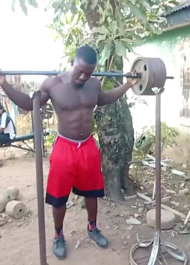 muscular, shirtless man in red shorts preparing to squat with a barbell loaded with weight plates. He is standing outside on a dirt surface, with a tree visible in the background and exercise equipment nearby. Another man sits on a weight bench in the background. The squat rack is homemade. The first man speaks, asking someone to put a pipe underneath the barbell.
