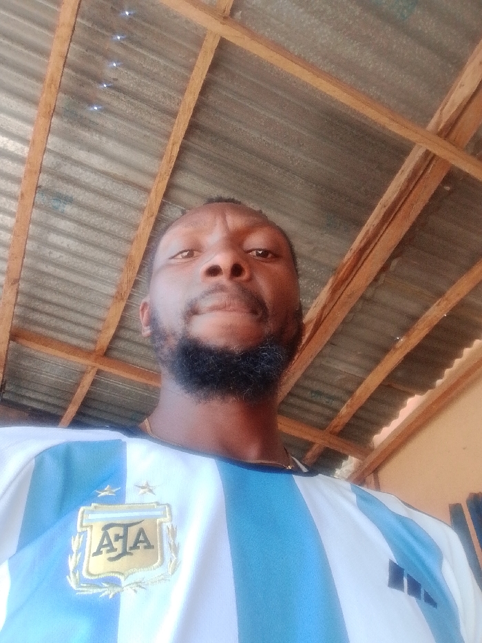 The image displays a close-up, slightly low-angle shot of an adult male. He has dark skin, a full dark beard and mustache, and short dark hair. He is wearing a light blue and white vertically striped football jersey, which features a gold-colored emblem with the letters "AFA" and two gold stars above it on the left chest, indicative of the Argentina national team. A thin gold-colored chain is visible around his neck. The man looks directly into the camera with a neutral expression. The background reveals an overhead view of an exposed roof structure, comprising corrugated metal sheets supported by a framework of light-colored wooden rafters and beams. A small section of a light orange-tan wall is visible on the far right. The precise location within the city of Jos, Nigeria, cannot be determined from the visual content of the image.