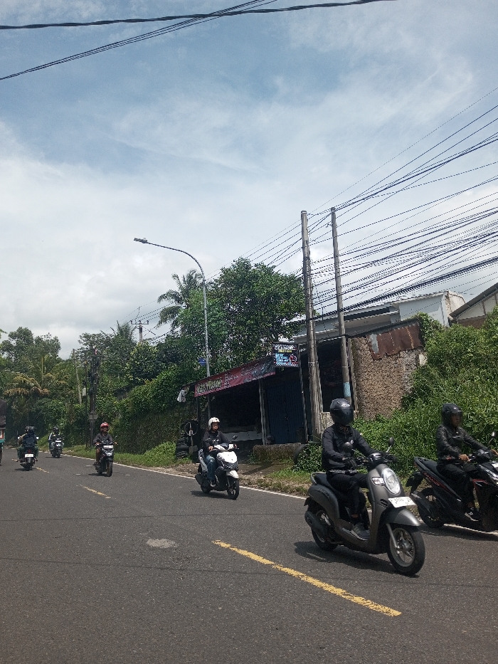 A street view with a single yellow line. Several individuals are riding motorbikes on the road. A building with a red awning sits alongside the street, near tall trees. Electrical poles and wires are strung above. The sky is blue with scattered clouds.