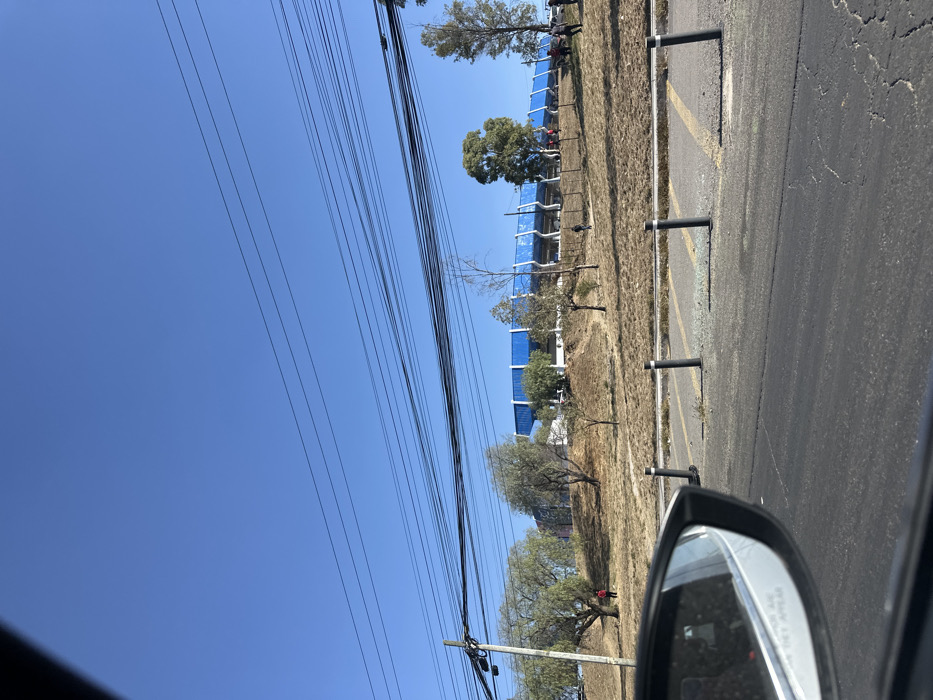 A clear blue sky fills most of the frame, intersected by parallel power lines. A roadside scene includes a paved road, black bollards, and a grassy area with trees. A blue-roofed structure is visible in the background, possibly a building or stadium. The image appears to be taken from inside a car, as part of the side mirror is visible in the lower right corner. The landscape is dry, indicating a warm climate or season.