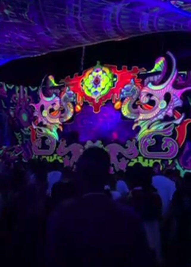 crowded outdoor event under a patterned purple and blue canopy. The focus is a stage featuring complex, glowing designs in neon colors, including stylized dragon heads and geometric shapes. Silhouetted figures of people are visible in the foreground, dancing to the music. The overall atmosphere is dark with vibrant lighting.