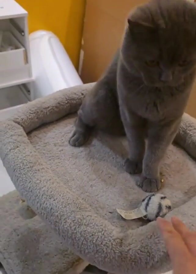 grey British Shorthair cat sitting on a grey cat tree. A person's hand reaches towards the cat, seemingly to play with it. The cat initially stands still, then playfully bats at the hand with its paws. The background includes a yellow wall, a white cabinet with drawers, and cardboard boxes.
