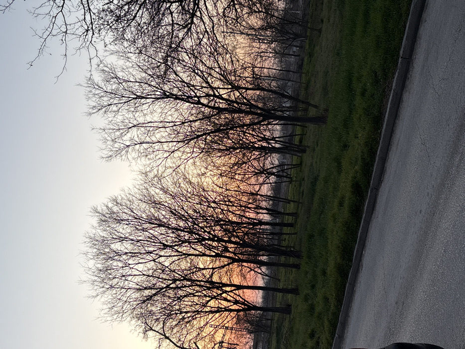 The image depicts an outdoor scene during twilight, characterized by a sky gradient from light grey-blue overhead to vibrant orange and pink hues near the horizon, indicative of either sunrise or sunset in Plovdiv, Bulgaria. A dense grove of numerous deciduous trees, currently devoid of foliage, forms a prominent silhouette across the mid-ground, their intricate branch patterns sharply defined against the colorful sky. The ground beneath the trees is covered by an expanse of green grass, sloping gently upwards from the foreground. In the immediate foreground, a dark asphalt surface, characteristic of a road or path, runs horizontally, bordered on its right by a low, light-colored concrete curb. A fragmented, dark-colored object, consistent with a vehicle's side panel, is partially visible at the extreme lower-left edge of the frame. Through the bare tree branches in the left mid-background, industrial-type structures, including a tall metal utility pole with crossbeams, are faintly discernible, indicating proximity to an urban or industrial periphery. No human figures are present.