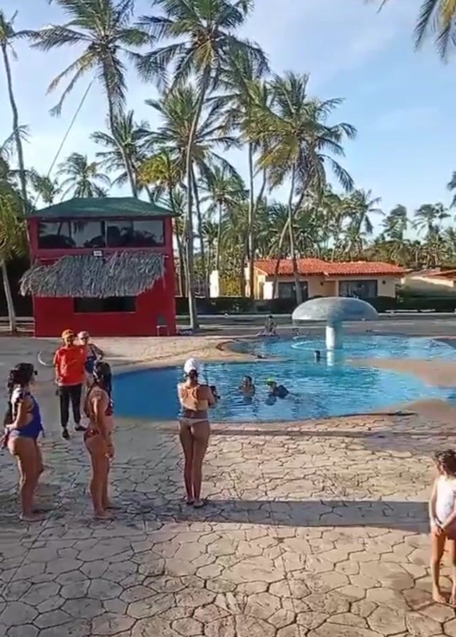 . The video shows a group of people at a tropical resort pool. Some of the people stand in a line, appearing to be participating in some activity or demonstration. A lifeguard tower is visible near the pool. The sky is blue, and tall palm trees surround the pool. Other resort buildings are in the background. There are children in the foreground as well. The pool has a fountain in the center and several people are swimming.