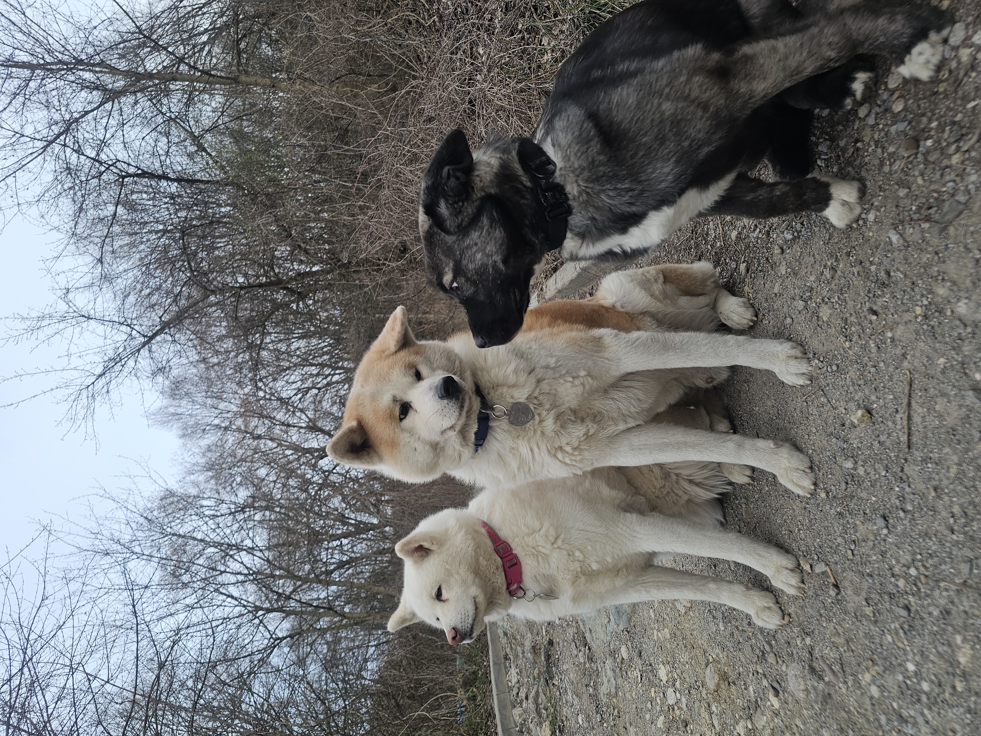Three dogs are lying on a dirt path. A dark grey and white dog is standing over two Akita dogs, one tan and white and the other white. The dogs are wearing collars. The background includes bare trees and shrubs. The location is unspecified in the city of Sofia, Bulgaria.
