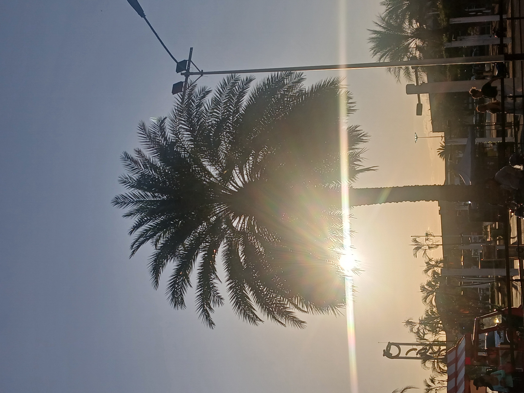 sunny day in Ciudad Guayana, Venezuela, featuring a large palm tree silhouetted against the bright sun and blue sky. A street lamp is visible to the left of the palm tree. In the background, there is a line of buildings and palm trees along a street, where people are visible walking. A red vehicle is parked on the right side of the image.