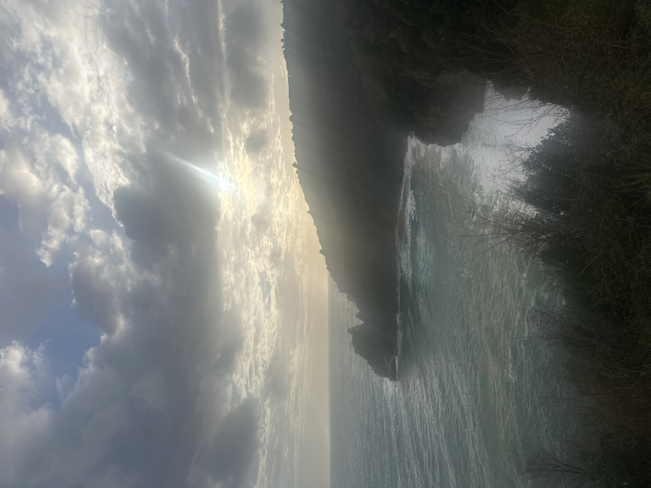 The image displays a coastal scene in Budva, Montenegro, specifically along the Adriatic Sea coastline. The vantage point is elevated, overlooking a rugged bay or cove. The upper portion of the frame is dominated by a heavily clouded sky, featuring a mix of dark grey, light grey, and white cloud formations. A bright crepuscular ray emanates from a hidden light source (sun) in the upper right quadrant, piercing through a break in the clouds and casting a diagonal beam of light across the mid-ground. Patches of pale blue sky are discernible through thinner cloud cover in the upper left. The mid-ground consists of the Adriatic Sea, exhibiting a greenish-blue coloration with areas of turquoise near the shore. Numerous white-capped waves are visible across the water, actively crashing against the rocky coastline. A dark, heavily vegetated headland juts into the sea from the mid-left. To its right, a larger, densely forested hillside or cliff face extends from the mid-right to the bottom right of the frame, meeting the sea. Waves are seen breaking and forming white foam at the base of this cliff. The sun's light partially illuminates the upper slopes of this hillside, while other sections remain shadowed. The immediate foreground features dark, dense, and mostly bare-branched shrubbery and tree foliage, consistent with a high observation point overlooking the natural coastal environment. No human figures or man-made objects are present in the observable scene. The primary actions involve natural environmental phenomena: waves crashing, and sunlight interacting with clouds and landforms.