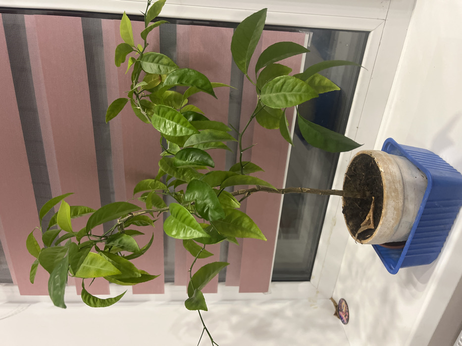 The image depicts an indoor scene in Kladovitsy, Russia, showcasing a potted plant positioned on a white windowsill. The plant, appearing to be a young citrus tree, features a slender brown trunk and numerous vibrant green leaves, some exhibiting lighter green or yellowish tones, and small thorns along some branches. It is contained within a light brown terra cotta-style pot, which in turn rests inside a rectangular blue plastic tray with vertical ribbing. Behind the plant, a window is visible, covered by a partially lowered roller blind with alternating horizontal stripes of dusty pink and dark gray. The window frame is white. To the left of the plant on the windowsill, a small, round, flat object with a colorful design is present. Faint discolorations are visible on the white wall surface to the left of the window. No individuals or active interactions are depicted.