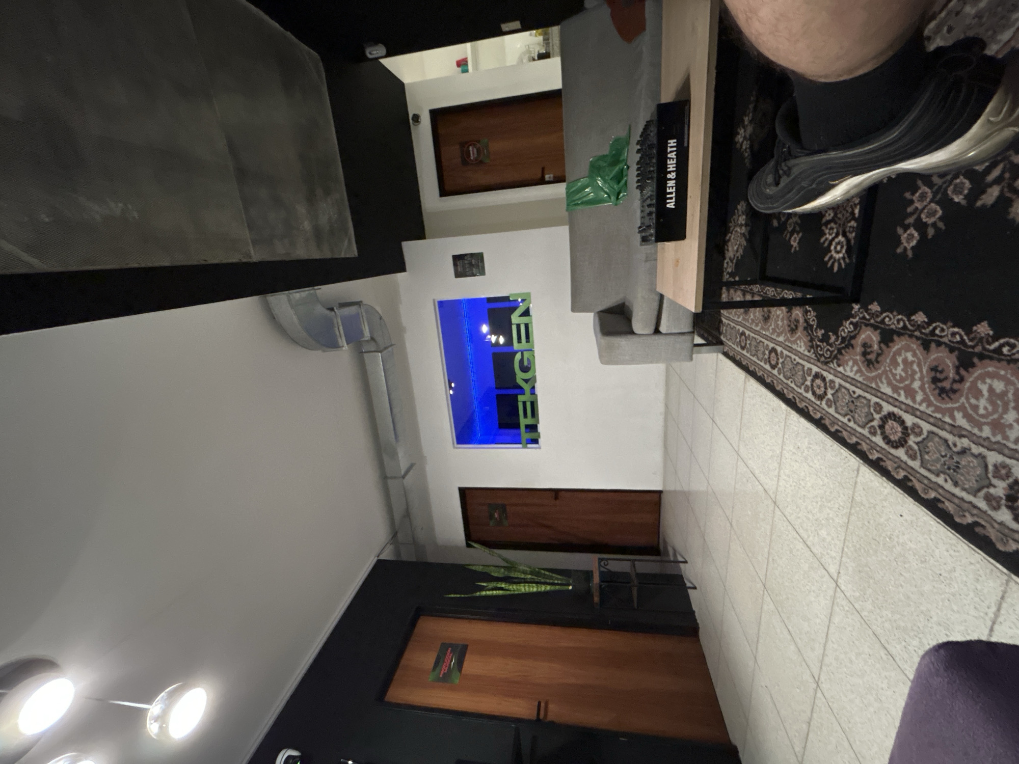 n interior space with a sofa, coffee table with a black Allen & Heath device, and a rug. A person's leg and shoe are visible near the coffee table. There are doors, one of which has a plant in front of it. A window with the word "TEIGEN" in green letters is also present. The lighting is from ceiling lights. The location could possibly be Buenos Aires, Argentina, but without more context or specific markers in the image, this is only an educated assumption.