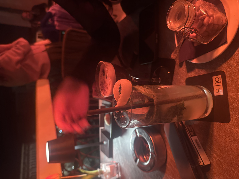 The image depicts a nighttime scene at an outdoor bar or rooftop terrace, illuminated by a dominant red artificial light source. In the immediate foreground, a tall glass containing a clear beverage with mint leaves, ice, a dark straw, and an orange peel garnish rests on a black coaster branded "H10 HOTELS." Adjacent to it is a stemmed glass holding a dark beverage topped with foam and dark sprinkles. Other objects on the table include a circular metal ashtray, a dark cigarette packet next to a dark wallet or phone, and a small clear glass jar filled with nuts, presented on a white plate with a purple napkin. A small black dish containing two light-colored oval snacks is also visible. Further back, a small black cylindrical table lamp emits light, and a small clear vase with a pink tulip can be seen. Regarding people, a person's blurred right hand and forearm are visible in the foreground, suggesting motion near the drinks. In the mid-ground, a person wearing a light-colored top is partially visible standing. Another individual is dimly visible in the background. The environment suggests an urban rooftop or balcony setting due to a visible railing in the background, with distant, blurred structures. The pervasive red light creates a warm, atmospheric glow across the scene. Based on the "H10 HOTELS" branding, the location is identified as an H10 Hotel in Venice, Italy, likely its rooftop bar or terrace.