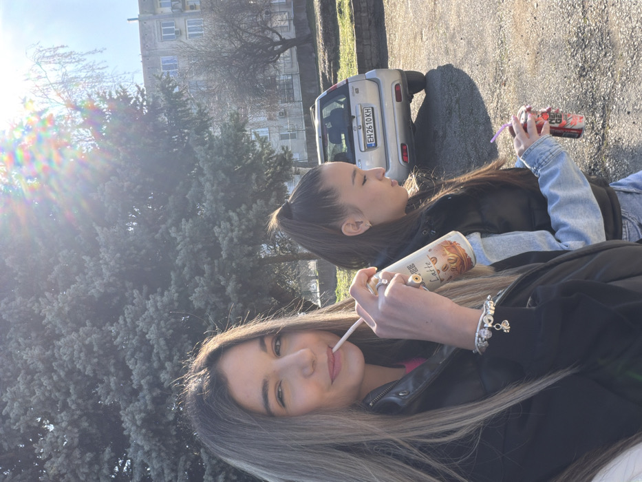 An outdoor scene in Cherven Bryag, Bulgaria, depicts two young females under bright sunlight. The female in the foreground, with long light brown hair, wears a black jacket over a visible pink top. She holds a white "Co-Fee Latte" can with a straw to her mouth, appearing to drink, and wears a silver charm bracelet on her left wrist. She looks directly towards the viewer with a slight smile. Behind her and slightly to the right, a second female with dark hair tied in a high ponytail wears a black vest over a light blue denim jacket. She holds a red beverage can with a purple straw, looking downwards and away from the camera. In the mid-ground, a silver hatchback vehicle with Bulgarian license plate EH 2610 KH is parked on a paved surface. The background features a large evergreen tree to the left, bare deciduous trees, and a multi-story concrete building with multiple windows. Strong sunlight from the upper right creates lens flare.